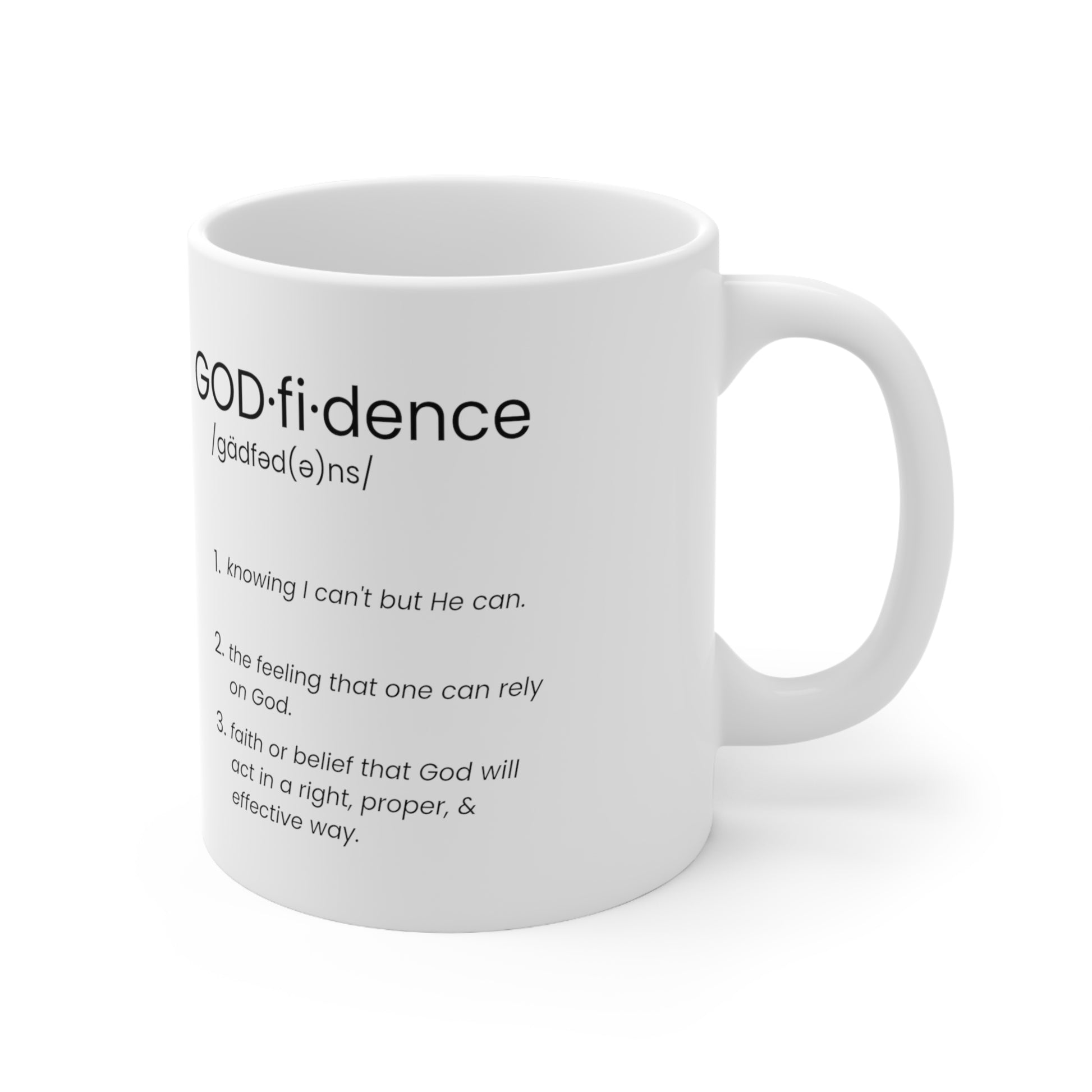 Una de nuestras favoritas. Esta taza no solo sostiene tu bebida perfecta, sino que también te impulsa con 'Godfidence', una combinación poderosa de confianza y fe. Con un mensaje de fe, esta taza es un recordatorio diario de confiar en tus habilidades mientras te apoyas en la fuerza divina. Cada sorbo es un acto de fortaleza y conexión espiritual. Deja que esta taza sea tu compañera en el viaje, infundiendo cada día con la confianza que proviene de una fe inquebrantable. ¡Vive con 'Godfidence' y afronta cada desafío con la certeza de que estás respaldado por algo más grande!